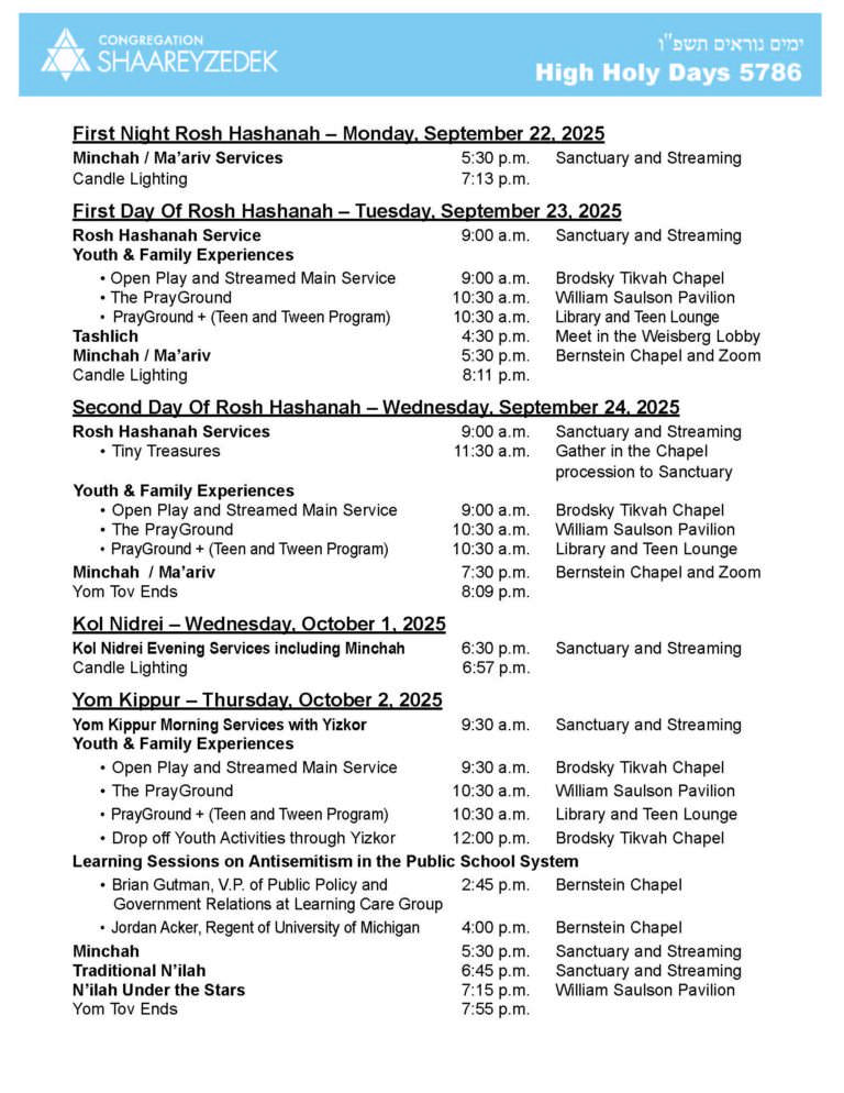 The High Holidays are a sacred and meaningful time at Congregation Shaarey Zedek, and we’re here to help you feel prepared, connected, and inspired. Whether you’ve joined us for years or this is your first time celebrating with our community, you’ll find everything you need right here—from tickets and prayer books to youth programs and livestream access. We invite you to explore the information below, and as always, please don’t hesitate to reach out if you have any questions. Shanah Tovah!